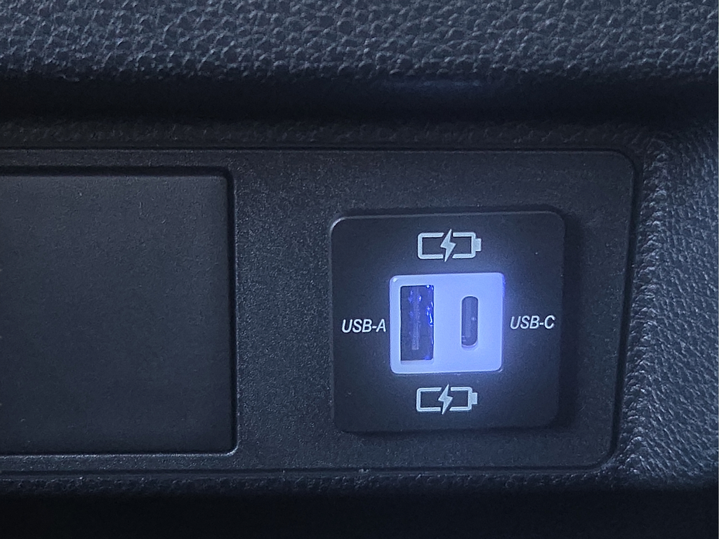 Dual illuminated rear center console-mounted USB charging ports.